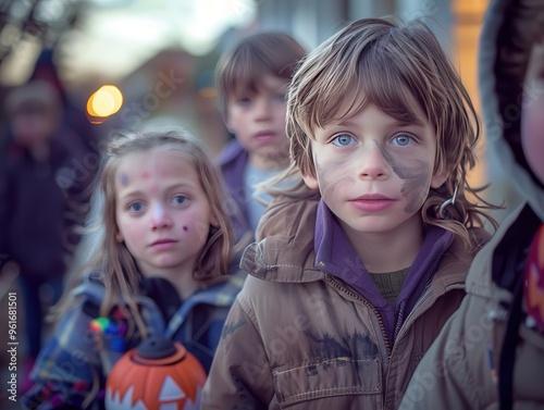 Group of children in costume with face paint, enjoying Halloween festivities outdoors during twilight, with pumpkin-themed accessories.