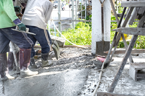 Group of construction workers wear boots and use hoe in pouring cement for new house build.