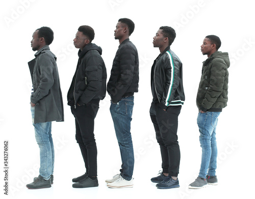 group of diverse guys standing in turns . isolated on white