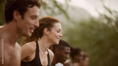 group of diverse individuals engaging in outdoor fitness session surrounded by lush greenery and natural beauty