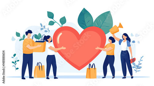 Group of diverse people holding big heart symbol and donation box with shopping bags and leaves around, community support and charity concept vector illustration