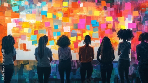 Group of Diverse Women Admiring Colorful Art Display in Studio