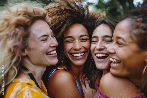 Group of diverse women laughing joyfully in a natural setting, embracing friendship.