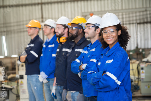 Group of diversity male and female engineer workers at work in the industry factory and wearing safety uniform, helmet while standing with arms crossed at production line