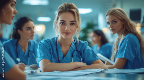 Group of female doctors in blue scrubs collaborating in a professional healthcare setting, highlighting teamwork and dedication to patient care.