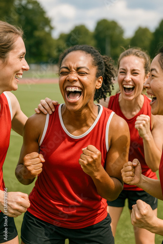 woman, sport, team, happiness, celebration, joy, field, teamwork, activewear, red, energy, competition, oneness, success, smiling, athlete, friends, motivation, exercise, fitness, active, togetherness, victory, enthusiastic, cheerful, winning, fun, support, camaraderie, energetic, playful, lively, friendship, emotion, triumph, positive, physical exercise, lifestyle, health, group, dynamic, spirited, excited, bonding, empowerment, recreation, enjoyment, achievement