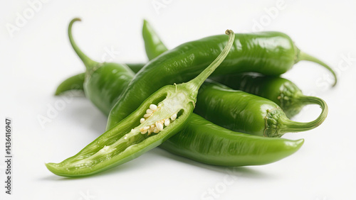 Group of fresh green chili peppers with one sliced to show inside, placed on a clean white background
