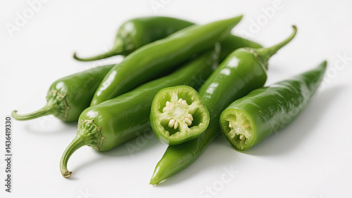 Group of fresh green chili peppers with one sliced to show inside, placed on a clean white background