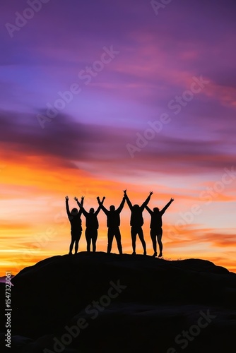 silhouette, sunset, celebration, friendship, teamwork, joy, adventure, happiness, travel, oneness, nature, mountain, colorful sky, group, lifestyle, achievement, excitement, exploration, evening light, calmness, harmony, freedom, peak, iconic, togetherness, camaraderie, scenic view, fun, standing, anticipation, journey, leisure, wildness, health, diversity, inspirational, love, bonding