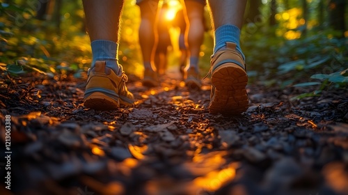 group of friends hiking together, wearing shorts and sneakers on an outdoor trail in the woods during sunset