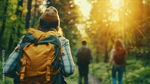 Group of friends on an outdoor adventure, hiking through a forest, nature exploration, bonding experience, scenic trail