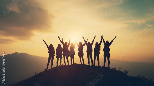 Group of friends raising hands in celebration on mountain peak at sunrise, team unity, victory, accomplishment, outdoor adventure, hiking together, friendship, silhouette, morning light