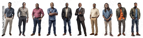Group of full body black men each all with different ages, sizes, hairstyles, facial hair, clothing, separately isolated on a white background. Illustration created with Generative AI technology.