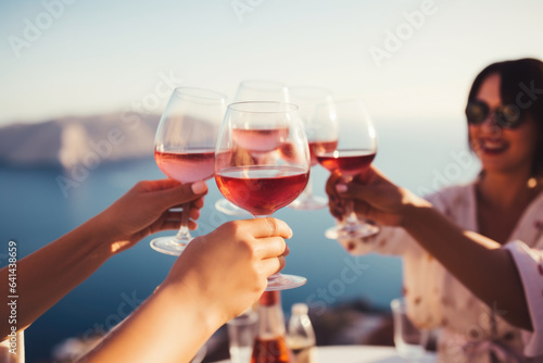 Group of happy female friends celebrating holiday clinking glasses of rose wine in Santorini