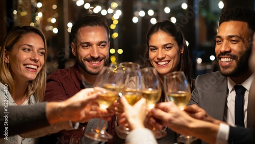 Group of happy friends toasting with white wine at festive dinner in cozy restaurant.