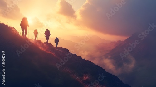 Group of hikers silhouetted against a sunset sky climbing a mountain ridge