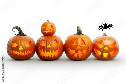 halloween, pumpkin, creepy, skittish, decoration, bat, glowing, festive, autumn, trick or treat, scarey, holiday, seasonal, eerie, sinister, fall, october, celebration, tradition, orange, glow, grin, design, lineup, white background, clean, vibrant, festivity, night, illuminated, horror, season, haunted, lantern