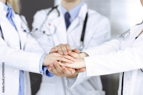 Group of modern doctors joining hands as a circle and ready to help patients. Teamwork in medicine during Coronavirus pandemic. Covid 2019