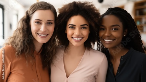 Group of multiethnic women friends smiling together in office, Happy diverse ethnic female colleagues coworkers show friendship at workplace.
