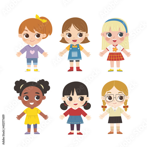 Group of multiracial children. Happy kids collection. Happy student standing together. Isolated on white background.
