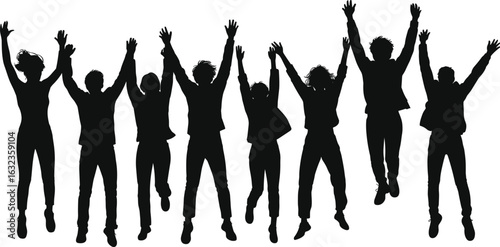 Group of people jumping, silhouette, celebration, teamwork, unity, happiness, success, energetic, joyful, fun, togetherness, excitement, achievement, motivation