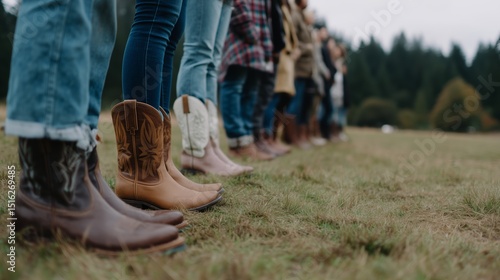 activity, alignment, area, attire, boot, camaraderie, casual attire, cloudy, community, country, countryside, day, diversity, earth, event, fashion, fellowship, field, footwear, friendship, gathering, grassy, group, leisure, lifestyle, line, man, natural, nature, outdoors, overcast, panoramic, participant, people, relaxation, rural, scenic, setting, shoe, social, standing, style, together, tone, tree, oneness, view, woman