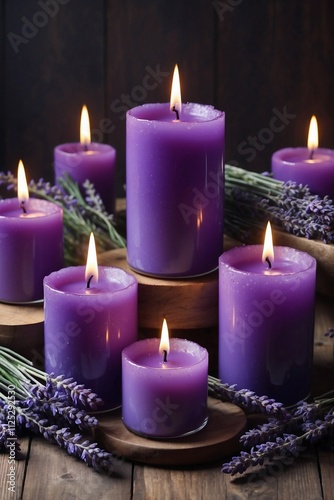 Group of Purple Candles and Lavender Flowers Surrounded by Lavender Oil