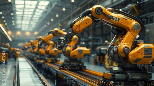 Group of Robotic Arms on a Conveyor Belt in a Modern Factory