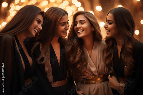 Group of Saudi Arabian young woman, elegantly dressed in traditional attire with a modern twist. They are gathered in Riyadh
