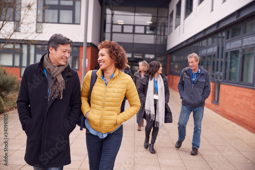 group, mature, adult, student, learning, education, studying, walking, outdoors, leaving, building, activity, hall, college, skill, training, people, person, 50s, 50s, 60s, 60s, passing, course, exam, smiling, friends, man, man, male, woman, woman, female, middle-aged, hispanic, caucasian, african american, asian, multicultural, horizontal, together, winter, autumn, fall, talking, chatting