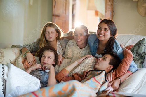group, teenage, fun, watch, television, sofa, arms raised, backlit, blanket, boy, cape town, casual attire, clothes, comfortable, culture, day, domestic, 5, friendship, girl, happy, indoor, lean, leisure, lifestyle, living room, people, playful, shout, to sit, south africa, success, togetherness, youth