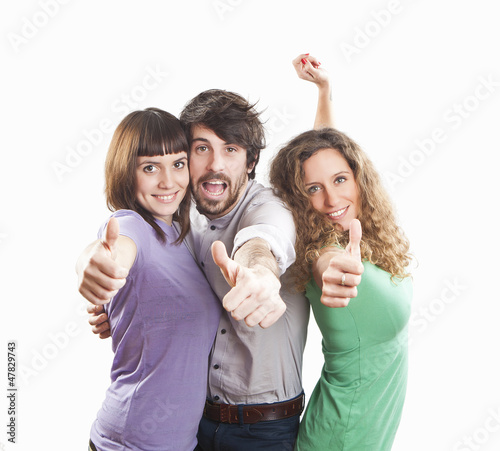 adult, background, beautiful, casual attire, caucasian, cheerful, college, female, finger, friends, friends, friendship, fun, gesture, girl, group, hand, happiness, happy, isolated, joy, joyful, laughing, lifestyle, male, man, man, people, person, portrait, positive, signs, smile, student, success, successful, team, thumb, together, up, youth