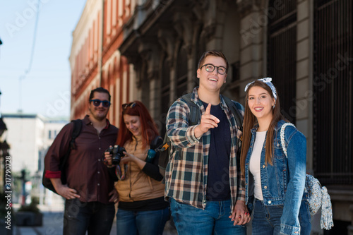 city, holiday maker, friendship, explorer, city life, exploration, backpacker, woman, outdoors, street, activity, adult, adults only, adventure, backpack, casual clothes, cheerful, city street, day, happiness, horizontal, journey, lifestyle, looking, male, man, pedestrian, people, photo, pointing, redhead, serbia, smiling, sunglasses, sunlight, talking, togetherness, travel, travel destination, walking, young adult, missy