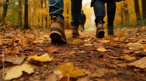 Group of tourists walks along the path of the autumn forest. Feet close-up. Traveling in a small group.