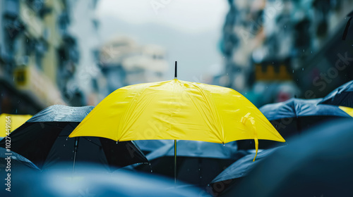 Group of umbrellas are open in the rain, with one yellow umbrella in the middle