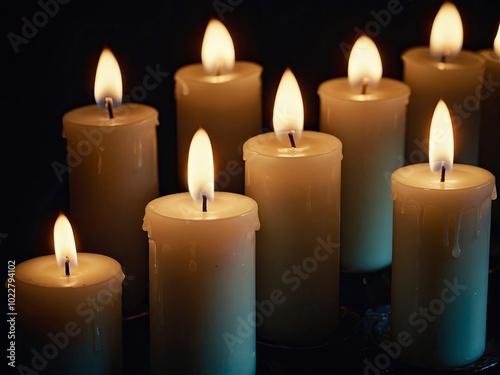 Group of white candles burning in the dark. Illuminated white candles in darkness