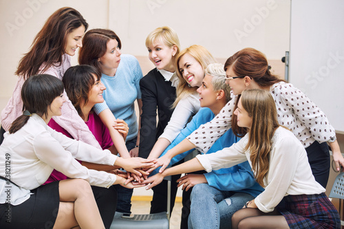 Group of women in the office at the seminar together discuss topics of interest