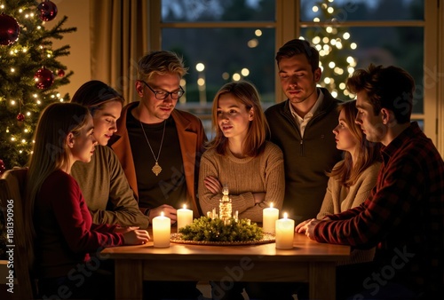 Group of Young Adults Gathered Around a Table with Lit Candles at Christmas