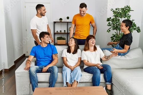Group of young friends smiling happy sitting on the sofa at home.