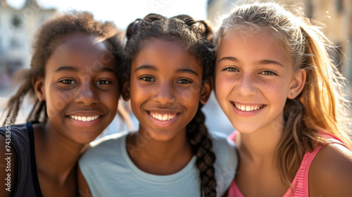 person, smile, friendship, portrait, children, happy, childhood, friends, outdoors, girl, cute, fun, together, horizontal, cheerful, group, park, children, female, summer, african, playing, face, expression, lifestyle, standing, outside, day, pretty, nature, enjoyment, three people, bonding, hugging, photo, playground, blue