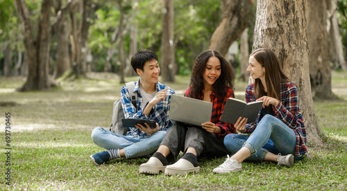 Group of young interracial diverse university students chatting together outside, engaging in a discussion together, college campus, enjoying campus recreation. Happy friends