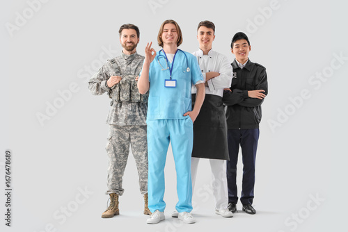 different, group, light, man, profession, uniform, young, adult, asian, background, body, boy, career, caucasian, chef, doctor, education, friends, gentleman, gesture, grey, guy, photogenic, happy, job, lifestyle, male, man, many, occupation, officer, ok, police, portrait, positive, service, soldier, success, work, men at work