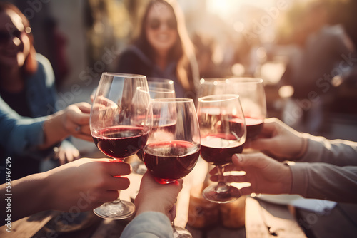 group of young, trendy millennials clinking their glasses of red wine while sitting outside, enjoying a convivial moment filled with laughter and joy ai generated art