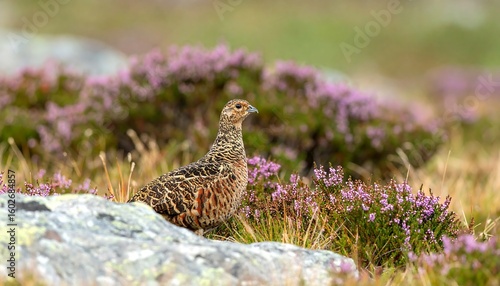 bird, grouse, heather, wild, nature, mountain, rocky, flower, wildlife, closeup, brown, pink, purple, flora, fauna, habitat, perched, sitting, environment, spotted, texture, grass, stone, detailed, photo, scenic, landscape, natural, leaf, zoom, detail, beauty, conservation, birding, wildflower, mountainous