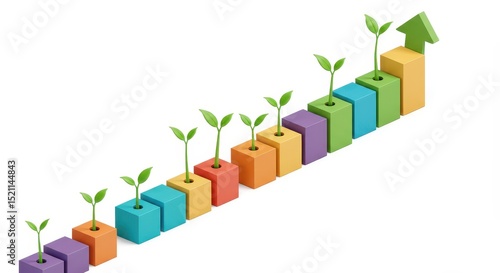 graph, bar, chart, growing, plant, germinating, growth, business, success, arrow, finance, economy, financial, investment, money, profit, increase, market, diagram, infographic, rising, upward, progress, development, white, isolated, concept, colourful, block, toy, step