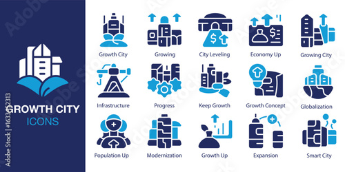 Growth City icon set. Containing Growth City, Growing, City Leveling, Economy Up, Growing City, Infrastructure and more. Solid vector icons collection. Vector illustration.