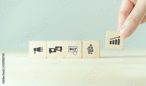 Growth of sales, marketing strategies concept. Data analytics for achieving business growth target. Increase sales in online store, e-commerce. Holding wooden cubes with sales growth. Postive progress