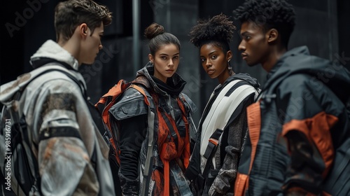 people, group, woman, boy, friends, together, jacket, clothing, grunge, dark, muted, vintage, provocative, defiant, messy, unusual, shades, minimalism, layered, dissatisfaction, authenticity, unconventional, asymmetrical, adventurous, criticism, oversize, neoprene, visibility, detail, fashion, face, person, model, style