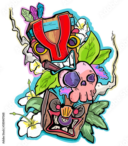 tiki, smoking, hawaiian, graffiti, vector, hawaii, cartoon, drawing, design, character, colourful, ganja, bar, skull, edgy, punk, urban, alternative, vintage, retro, distressed