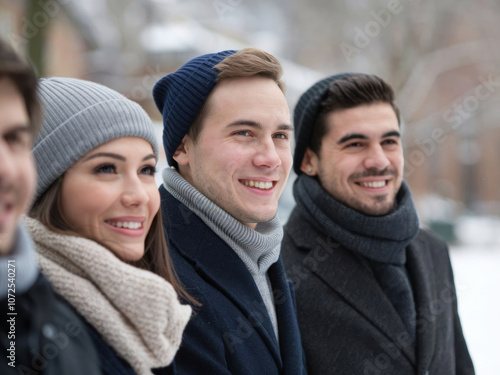 Grupo de jóvenes empresarios vestidos con ropa abrigada informal y sonriendo durante un frío día de invierno